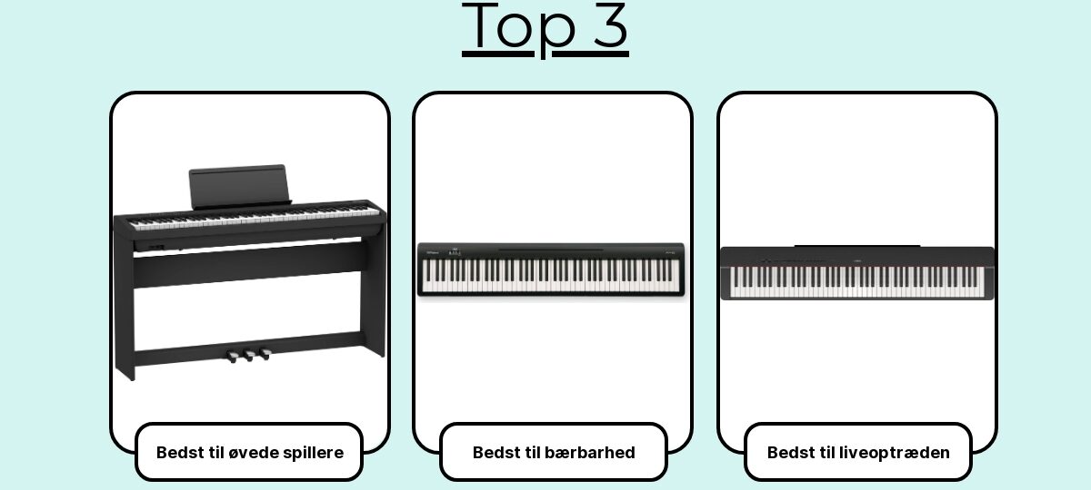 Yamaha P-525: Yamahas top i den bærbare P-serie. Den kombinerer de store CFX- og Bösendorfer-lyde med en fast, præcis tangentfornemmelse, som især klassiske pianister sætter pris på. En skarp allrounder til både øvning, undervisning og mindre scener.