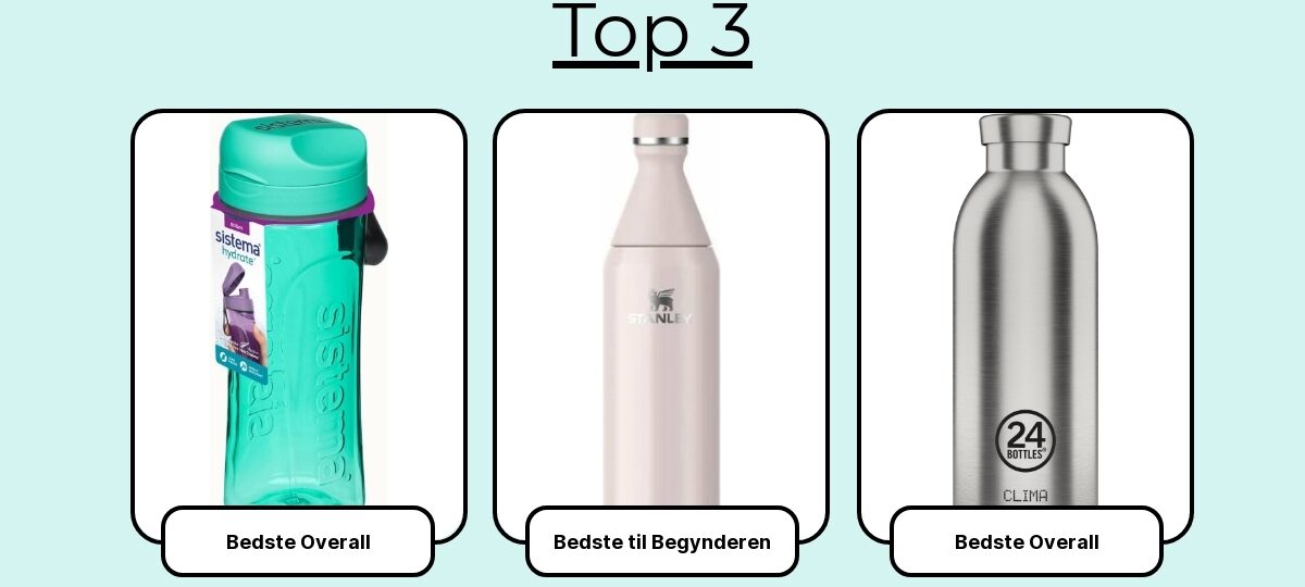 Jeg har testet alt fra dobbeltvæggede flasker i rustfrit stål til ultralette Tritan-modeller og glas til den helt rene smag. Låg med sugerør, tud og one-touch-knap er blevet åbnet med én hånd under løb, lækager er afsløret, og jeg har målt, hvor godt de holder på kulden, om de passer i kopholderen, og hvor nemt de er at rengøre – uden at tage smag.