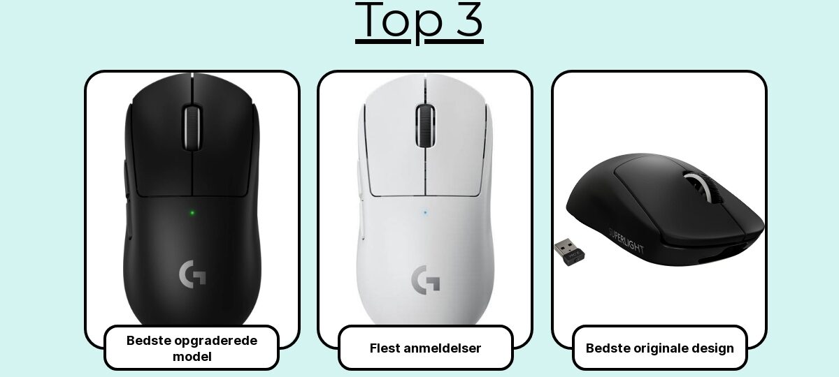 Logitech G Pro X Superlight 2: Den mest afrundede FPS-mus for flest hænder. Formfaktoren er neutral, vægten lav, og HERO 2-sensoren er ekstremt stabil. Jeg anbefaler den til claw/fingertip i mellemstore hænder og til palm i mindre hænder. Den valgfrie 4K-dongle er nice-to-have, ikke need-to-have. Svaghed: en smule glat coating for svedige hænder.
