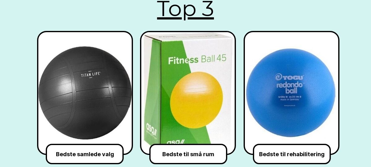 Bedste allround til hjemmet: en 65 eller 75 cm anti-burst bold med mat mikrostruktur, phthalatfri PVC, 300 kg statisk bæreevne og medfølgende pumpe. Den rammer balancen mellem pris, holdbarhed og greb og dækker 90 % af alles behov.