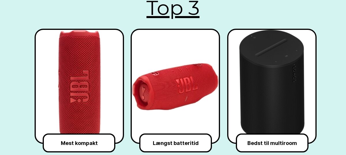 Sammenlignet med UE Boom 3 oplevede jeg Flip 7 som mere vokal-fokuseret og mindre rund i toppen — Boom 3 kan lyde mere “festlig”, men Flip 7 er bedre til podcasts og akustisk musik. Og kontra JBL Charge-serien er Flip 7 langt mere bærbar; til gengæld giver Charge ekstra slagkraft og powerbank-funktion, hvis du vil have mere volumenkraft og batterikapacitet.