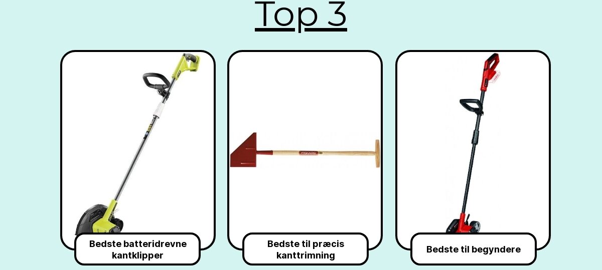 Manuelle kantskærere ligger typisk omkring 200–500 kr. En batteritrimmer med kantfunktion koster cirka 700–1.800 kr., alt efter batteripakke. Dedikerede batteridrevne kantskærere med metalblad ligger oftest i området 1.300–2.500 kr., afhængigt af om du har batteri i forvejen.