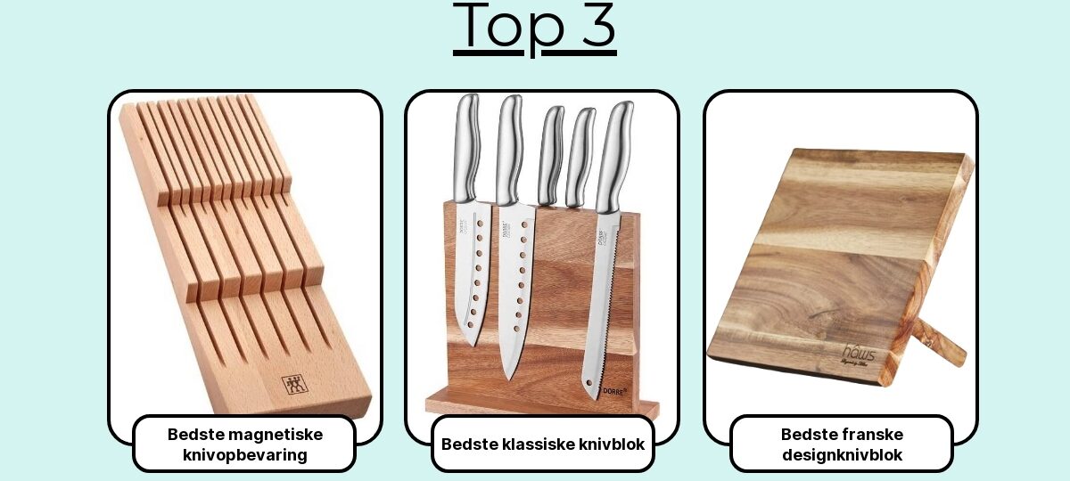 Jeg har håndtestet alt fra magnetiske blokke til universelle børsteindsatser og klassiske slids i eg, bambus og valnød. Jeg har fyldt dem med både japanske og europæiske knive, testet stabilitet på våde bordplader, tjekket magnetstyrke, renlighed og om materialet ridser klingen.