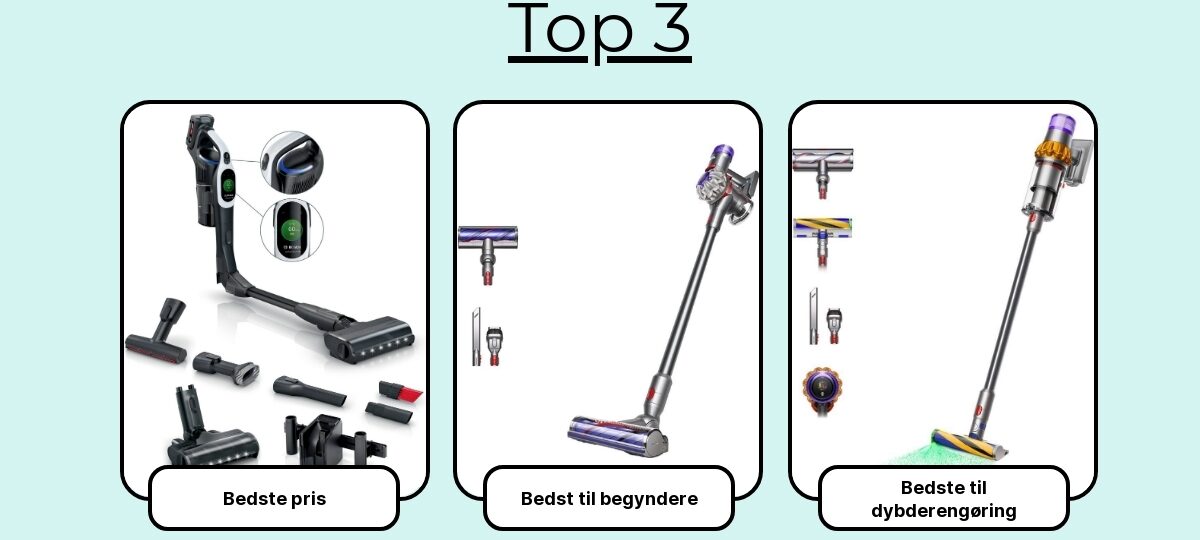 Mit råd: har du mange tæpper og kæledyr, giver en kraftig premium-model mening. Har du primært hårde gulve og kortere rengøringssessioner, kan en billigere model med soft roller være det klogere køb.