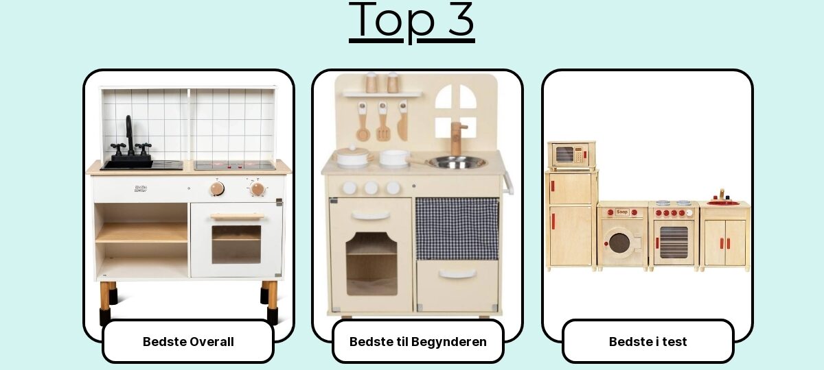 Her får du mine 7 favoritter. Udvalgt for deres holdbarhed, sikkerhed, legemuligheder og værdi for pengene – fra kompakte køkkener til små rum og robuste trækøkkener til sæt med lys/lyd og masser af tilbehør.