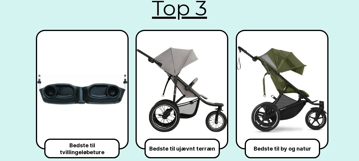 Jeg har testet på asfalt, brosten og grus, kørt slalom i skarpe sving og bombet lige ud med låst forhjul – både med luftfyldte og punkteringsfri dæk. Jeg har vurderet stabilitet ved fart, affjedring og vibrationsdæmpning, svingradius, hånd- og fodbremse, sele og kaleche, samt ergonomi for både høje og lave løbere. Og ja: foldemekanisme, vægt og opbevaringsplads tæller også, når man står med svedige hænder og en utålmodig mini.