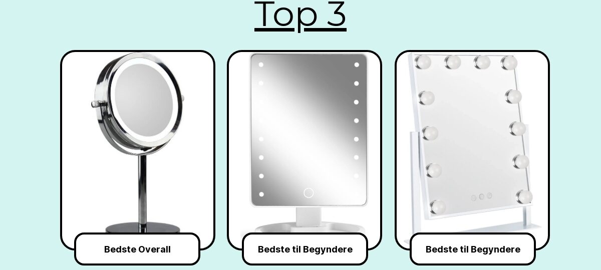 Her får du mine 7 favoritter – de makeupspejle, der klarede hverdagen bedst: til bordet, til væggen, til rejsetasken, med og uden lys, fra budget til premium. Korte, ærlige pointer – så du kan vælge rigtigt første gang.