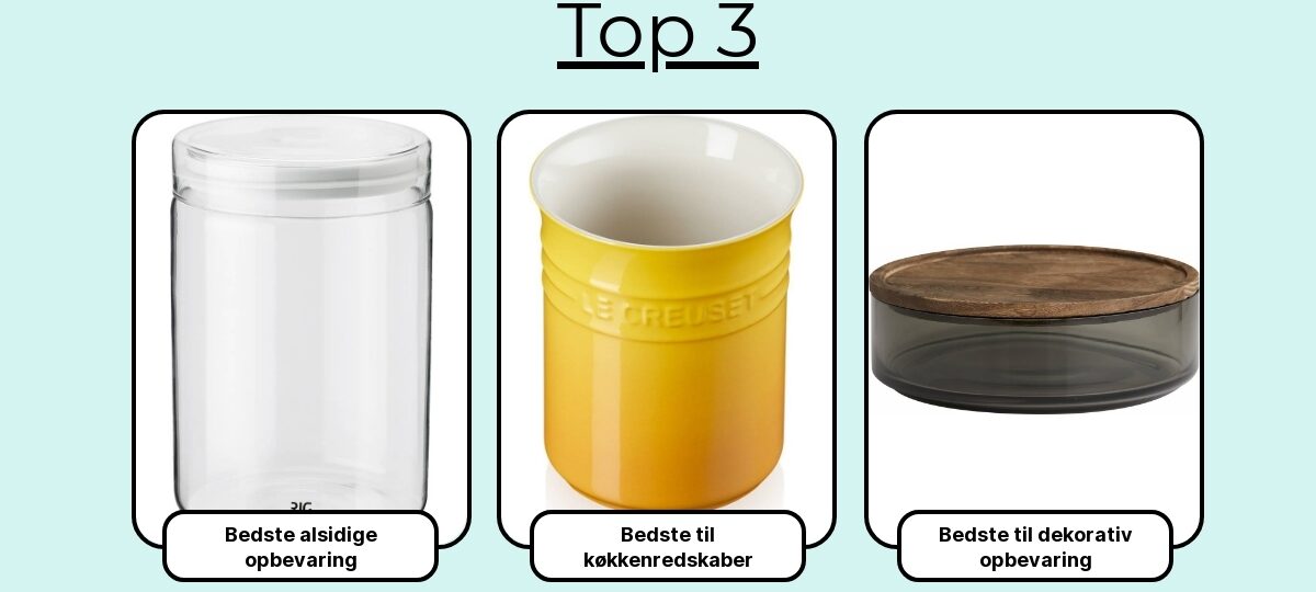 Resultatet? De 7 bedste opbevaringsglas, som holder tæt, ikke tager smag eller farve, er nemme at bruge – og som gør dit køkken mere overskueligt. Lad os dykke ned i dem.