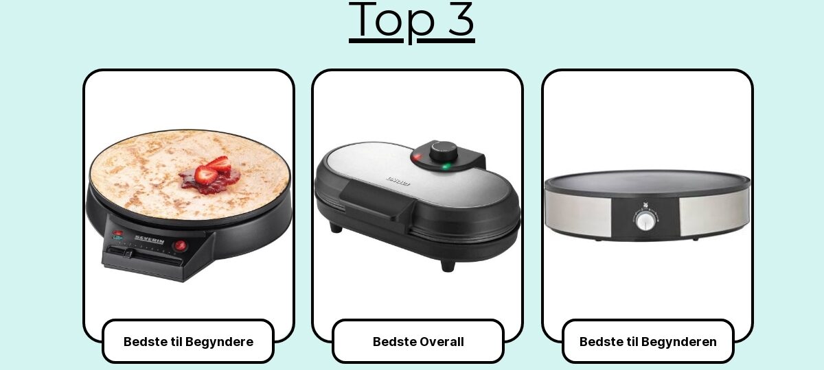 Her får du de 7 bedste pandekagemaskiner, som klarede sig bedst på varmefordeling, temperaturstabilitet, belægning, diameter og kant, tilbehør (dejfordeler/spatel) og ikke mindst rengøringsvenlighed. Så du kan vælge den, der passer til dine morgener – og dine pandekager.