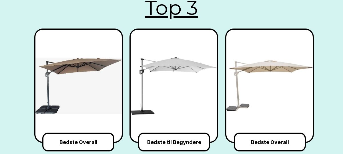 De sidste uger har jeg testet alt fra klassiske centerstangs-modeller til store hængeparasoller i alu og træ, med akryl- og polyesterdug. Jeg har vurderet stabilitet og base, hvor glat cranken kører, om vip/rotation er til at stole på, samt hvordan dugen står imod sol, regn og daglig brug.