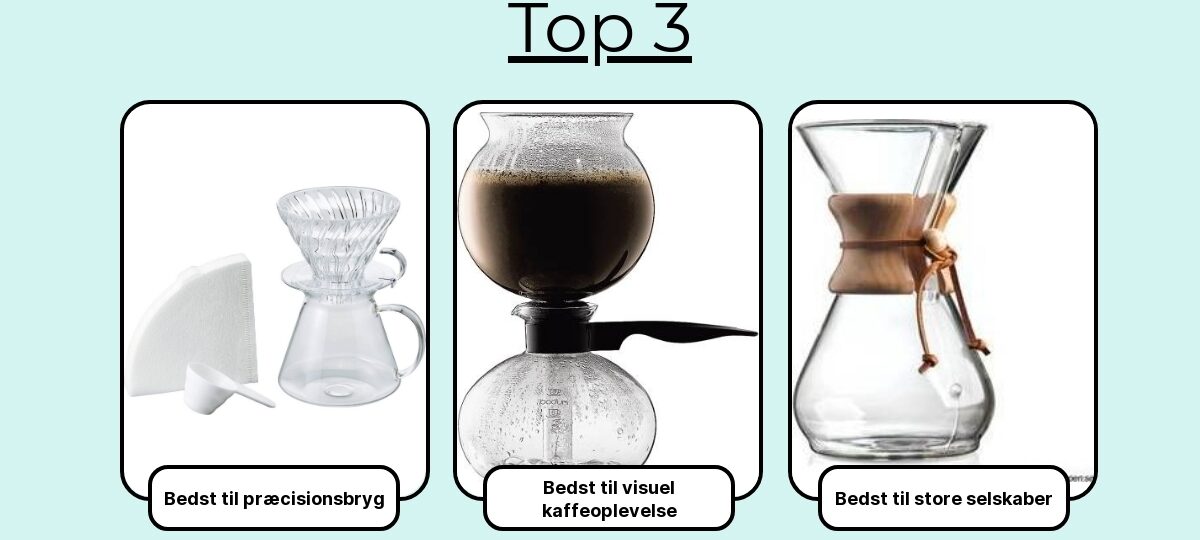 Jeg har testet lignende modeller som Hario V60 Glass Kit og Chemex, og her oplever jeg, at Bodum er den venligste indgangen: ingen papirfiltre, nem rengøring og hurtigt at få kaffe i hånden. Pebo giver længere varmehold, mens Chemex giver mere udpræget klarhed, men kræver papirfiltre og en lidt mere involved metode. Bodum er altså mit valg, hvis man vil begynde uden at gå helt galt i byen med teknik.