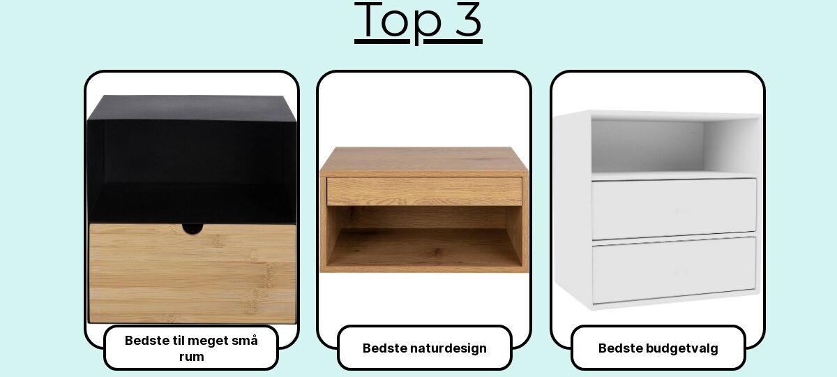 Jeg har især kigget efter: skuffer der glider silkeblødt (og ikke smækker), hylder der faktisk rummer en bog + briller, overflader der tåler kondens fra vandglasset, ledningshåndtering til oplader og lampe, samt om robotstøvsugeren kan komme under—plus den evige kamp mod vaklende ben. Derudover har jeg vurderet materialer (massivt træ vs. laminat), støj, samlingstid og prisværdi.