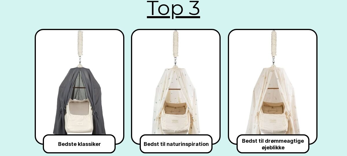 Bedst til baby: En let, åndbar bomulds- eller voilesenhimmel med bred åbning og minimal pynt. Fokus er ventilation, nem adgang og certificerede materialer tæt på barnet. Ophæng højt nok til, at små hænder ikke kan nå det.