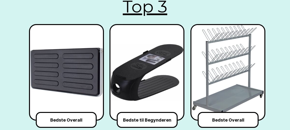 De bedste løsninger dækker forskellige behov: 1) Slank vægmonteret skohylde til små entréer, 2) Modulært reolsystem til familier, 3) Budgetvenlig metalreol, 4) Åben metalrist med drypbakke til vådt vejr, 5) Skoskab med klaplåger til et helt rent udtryk, 6) Stablebare kasser med klare fronter til sneakers og samlere, 7) Over-the-door skoholder når gulvpladsen er væk. Vælg ud fra dit rum, din skosamling og hvor meget du gider flytte rundt i hverdagen.