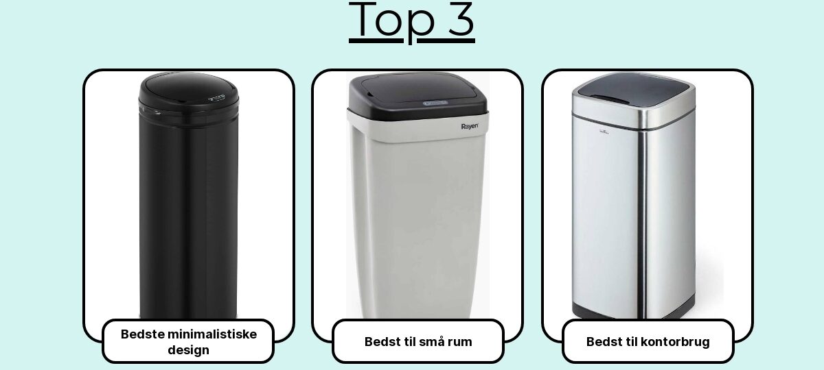 Her får du mine 7 favoritter: fra den kompakte til små køkkener, den robuste familieløsning, den ultra-støjsvage til nattebrug og selvfølgelig bedste køb til prisen. Lad os finde den sensor-skraldespand, der gør hverdagen smartere – og renere.