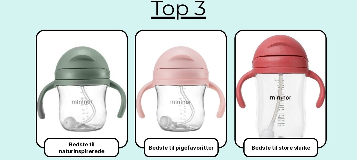 Til de yngste (6–12 mdr.) går jeg efter små kopper med bløde kanter og kort sugerør. Små volumener (150–200 ml) gør det lettere at styre vægten og sikrer hurtigere rotation af friskt vand.