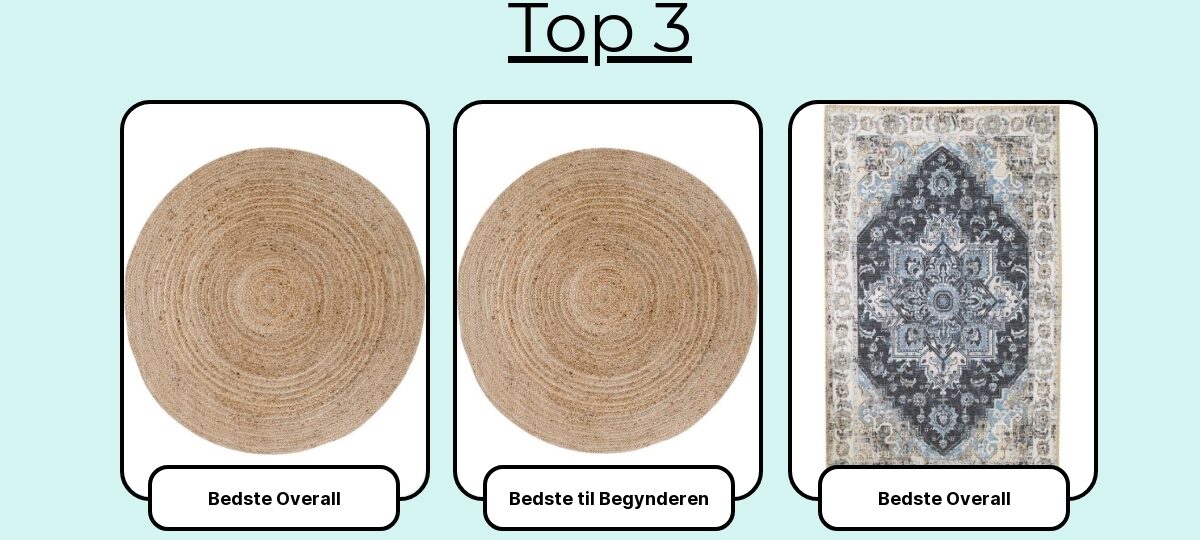 Her er min stramt kuraterede top-7, valgt for funktion, holdbarhed og æstetik. Bedst til stuen: et tæt, håndvævet uldtæppe (10–14 mm luv) for varme, elasticitet og naturlig pletafvisning. Bedst under spisebordet: et fladvævet tæppe i polypropylen eller genanvendt PET – lav luv, minimal krummefælder, let at støvsuge. Bedst til entré/gang: en polyamid-løber med skridsikker bagside og meleret struktur, som maskerer snavs og holder til sko. Bedst til soveværelset: et blødt, tæt skåret luvtæppe i uld eller kvalitets-polyester (12–18 mm) for komfort uden statisk knitreri. Bedst til små børn og vask: bomulds- eller rPET-tæpper, der kan maskinvaskes i mindre størrelser. Bedst naturlook: jute/sisal-blanding med kantbånd til tørre zoner – robust tekstur, men hold den fra fugt. Bedst udendørs/altan: UV-stabilt fladvæv i PP/rPET, dræner hurtigt og tørrer uden at mugne.