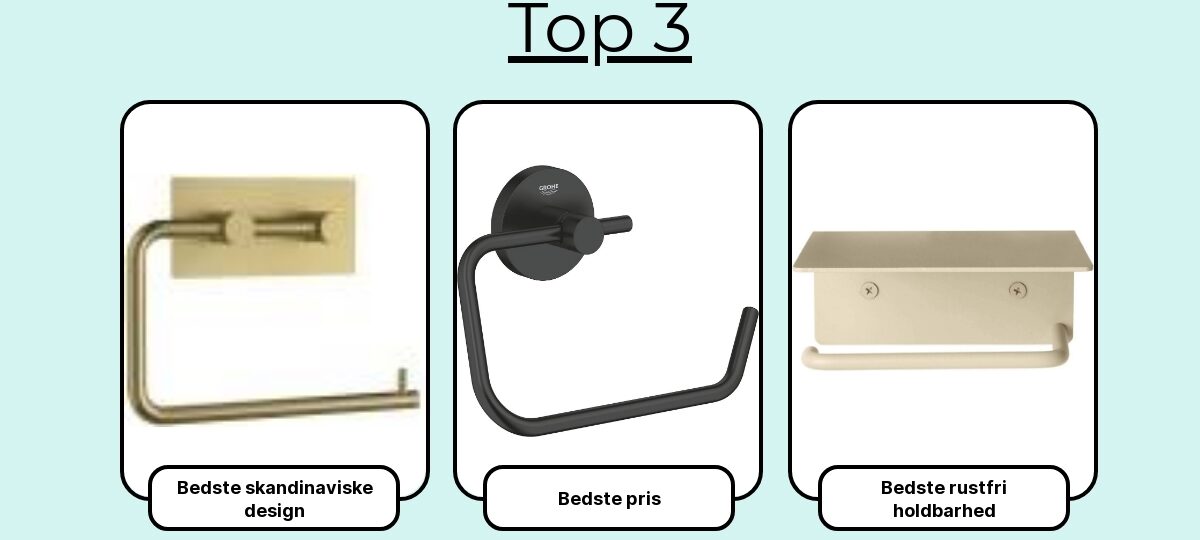 Når jeg laver en shortlist, prioriterer jeg: solidt basismateriale (rustfrit stål eller massivt messing), pæn og slidstærk overflade (f.eks. PVD eller kvalitets-pulverlak), skjult montering, plads til store ruller, korrekt friktion så papiret ikke løber løbsk, samt adgang til reservedele. Til sidst vægter jeg pris ift. langtidsholdbarhed – den billige, der må skiftes om to år, er sjældent billig i længden.