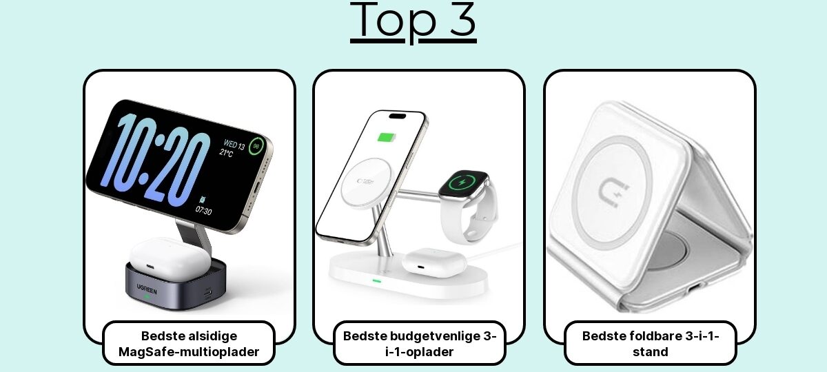 I denne roundup får du mine 7 favoritter – udvalgt efter reel brug i hverdagen: Jeg har målt opladningshastigheder på iPhone og Android, tjekket temperaturer, magnetstyrke og case-kompatibilitet, og vurderet detaljer som skridsikre overflader, LED-dæmpning og hvorvidt strømklods følger med (spoiler: det gør den alt for sjældent).