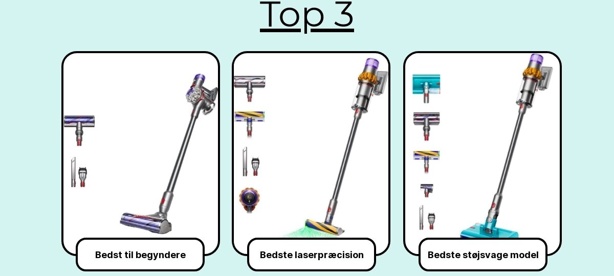 Hvis jeg skulle pege på de syv stærkeste køb lige nu, ville min kortliste se sådan ud: Dyson Gen5 Detect Absolute (bedst samlet og stærkeste filtrering), Dyson V15 Detect (skarpere pris, næsten samme rengøringsevne), Samsung Bespoke Jet AI (dock med automatisk tømning og stærk allrounder), Miele Triflex HX2 Pro (fleksibel vægtfordeling og stærk på tæpper), Tineco Pure One S15 Pro (god værdi med støvsensor), Shark Stratos IZ420 (fremragende mod hår og krummer med DuoClean) og Bosch Unlimited 8 (let, velafbalanceret og med 18V udskiftelige batterier).