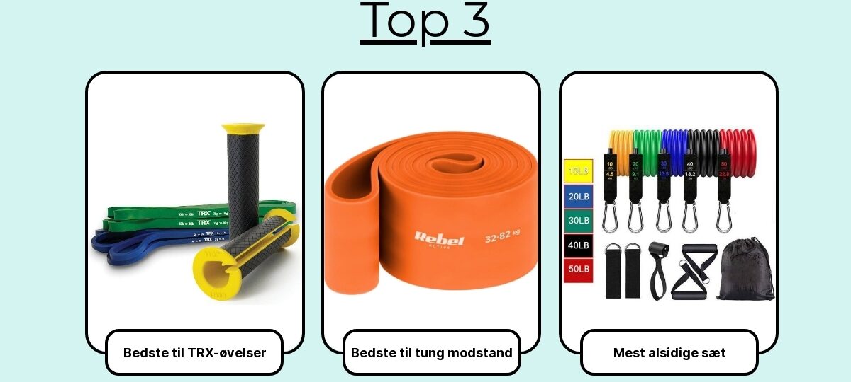 Jeg har kigget på modstandskurve og nøjagtighed, om de ruller eller niver, materialekvalitet (latex vs. stof), greb og tilbehør (håndtag, døranker), lugt og – vigtigst – holdbarhed under hård brug. Pull-up assistance, glute-aktivering, pres, rows, mobilitet: alt har fået turen.
