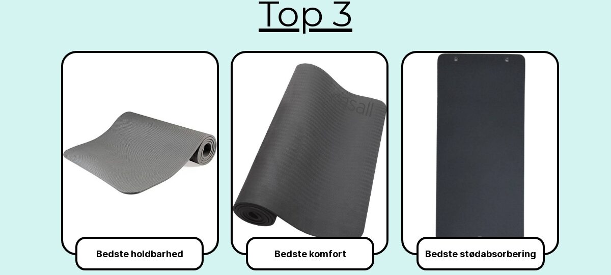Jeg har testet greb med svedige håndflader, stødabsorbering til knæ og ryg, stabilitet til balanceøvelser, holdbarhed med sko, hvor hurtigt de bliver rene igen – og om de lugter, krøller i kanterne eller glider på gulvet. Tykkelse, materiale, længde, vægt og bærestrop har også været i spil, fordi det hele betyder noget i praksis.