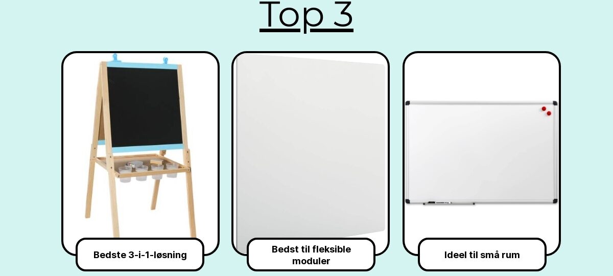 3) Bedste budget til hjemmekontor: En lakeret stål-tavle (magnetisk) i 90–120 cm. Kombiner med kvalitetsmarkere og ugentlig dybrens, så holder den pænt i mange år ved let brug.